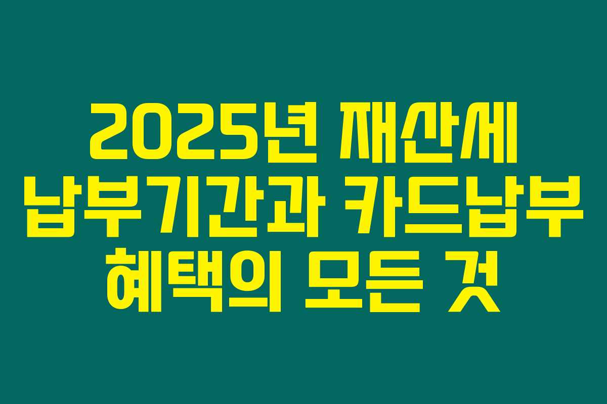 2025년 재산세 납부는 모든 시민에게 중요한 이슈로, 적절한 납부 기간과 카드납부 혜택을 활용하는 것이 필수적입니다. 아래를 읽어보시면 재산세를 효율적으로 관리하는 방법과 유용한 카드납부 혜택에 대한 정보가 담겨 있습니다.