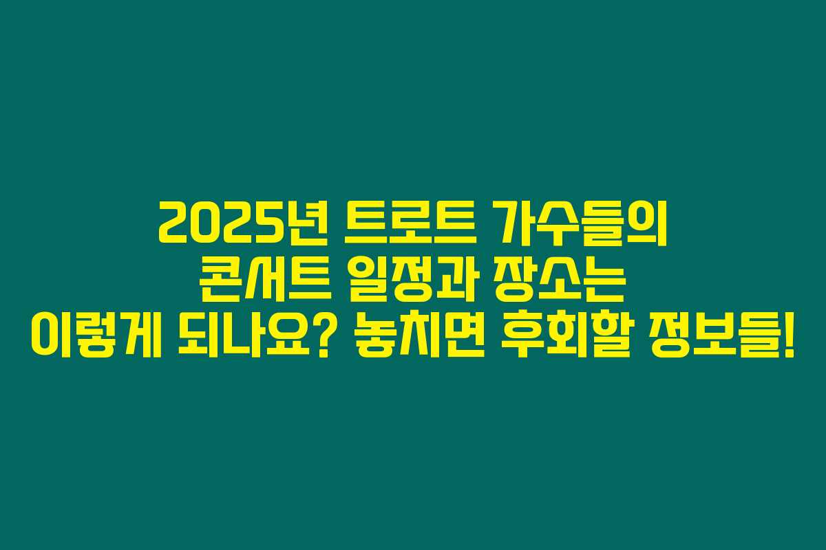 트로트 콘서트는 정말 놓치기 아까운 기회 아니겠어요? 좋아하는 가수의 콘서트를 계획한 대로 참석해 보세요. 이 좋은 정보를 통해 여러분의 문화생활이 더욱 풍성해지기를 바랍니다!