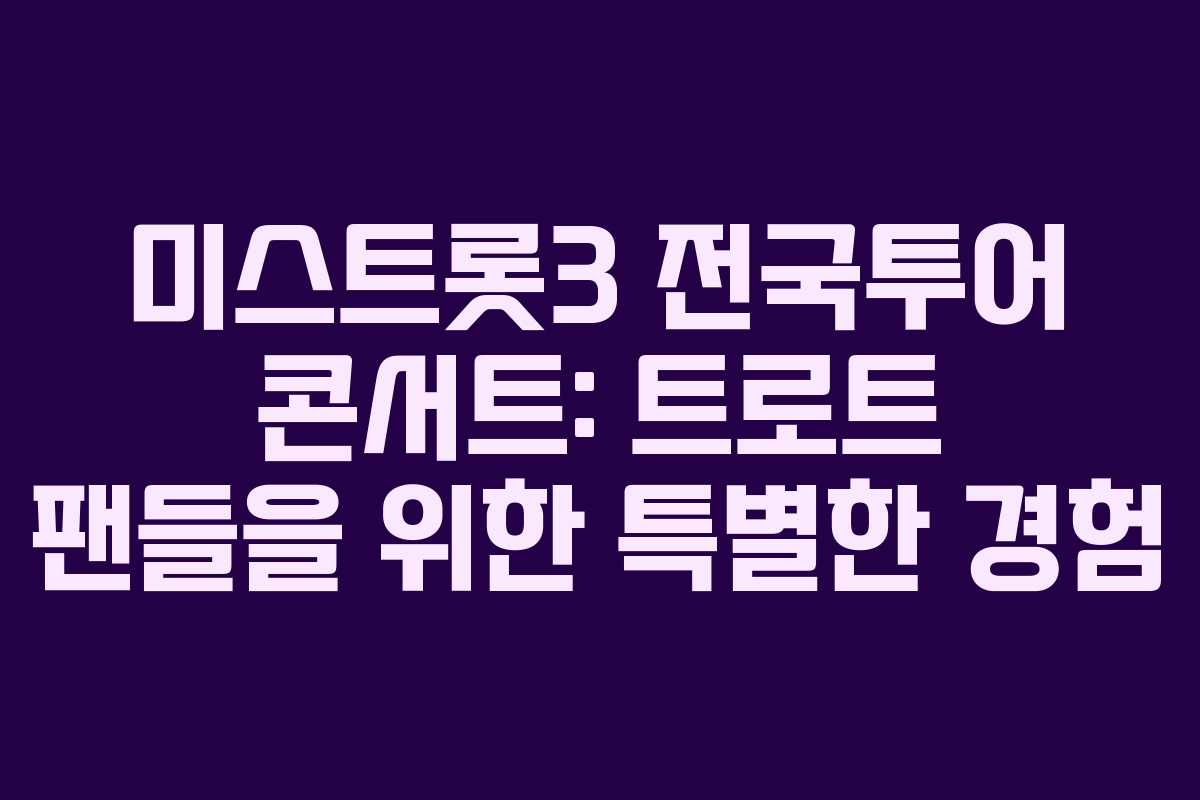 트로트 팬들에게 잊지 못할 경험을 선사하는 “미스트롯3 전국투어 콘서트”가 다가옵니다. 이번 콘서트는 미스트롯3의 인기 출연진들이 전국 각지에서 화려한 무대를 펼치며 팬들과의 소통을 더욱 강화할 예정입니다. 전 지역의 주요 도시를 순회하며 각 지역마다 특별한 게스트와 함께하는 깜짝 무대도 준비되어 있어 기대감을 더욱 높이고 있습니다.