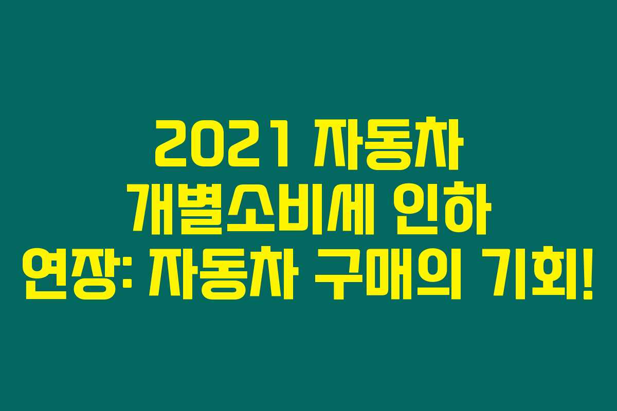 제가 알아본 바로는 2021년 우리 정부가 자동차 소비 촉진을 위해 개별소비세 인하를 연장하기로 결정했어요. 이 결정은 자동차 구매를 고려하는 많은 소비자들에게 큰 혜택이 될 것이라 생각합니다. 아래를 읽어보시면, 개별소비세 인하의 배경과 구체적인 혜택, 그리고 주의할 점에 대해 자세히 설명드리겠습니다.