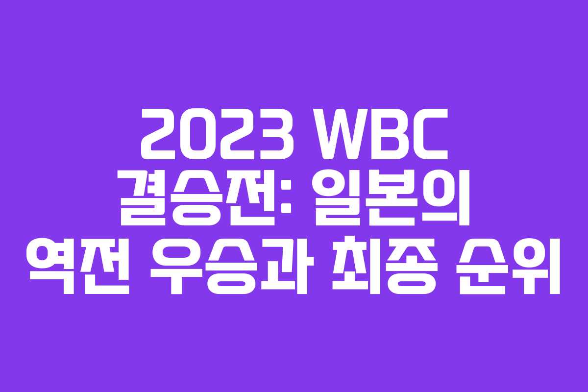 2023 WBC 월드클래식베이스볼에서 일본이 미국을 상대로 역전승을 거두며 최종 우승을 차지했습니다. 이번 대회는 코로나19로 인해 6년 만에 개최되었고, 세계 최고의 선수들이 참여하여 많은 주목을 받았습니다. 이 글에서는 결승전 경기 요약, 최종 순위 및 상금에 대해 알아보겠습니다.